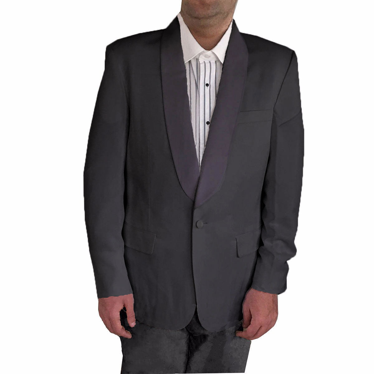 This one button 100% polyester men's shawl collar black tuxedo dinner jacket is fully lined with soft shoulder construction and a non-vented back It has 3 inside and 3 outside pockets and 3 button sleeves.
