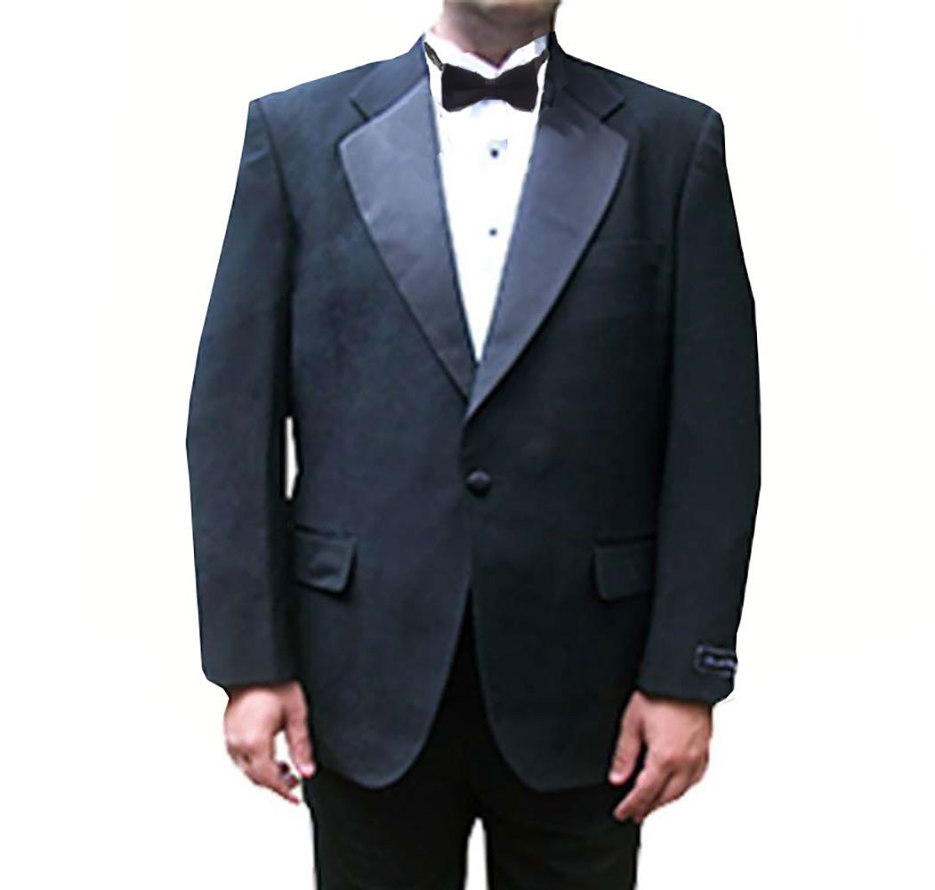 - 16 - Men's Tuxedo Jackets: Black notch collar one button tuxedo jackets with satin trim. 100% Wool (four pieces) and Polyester (twelve pieces).