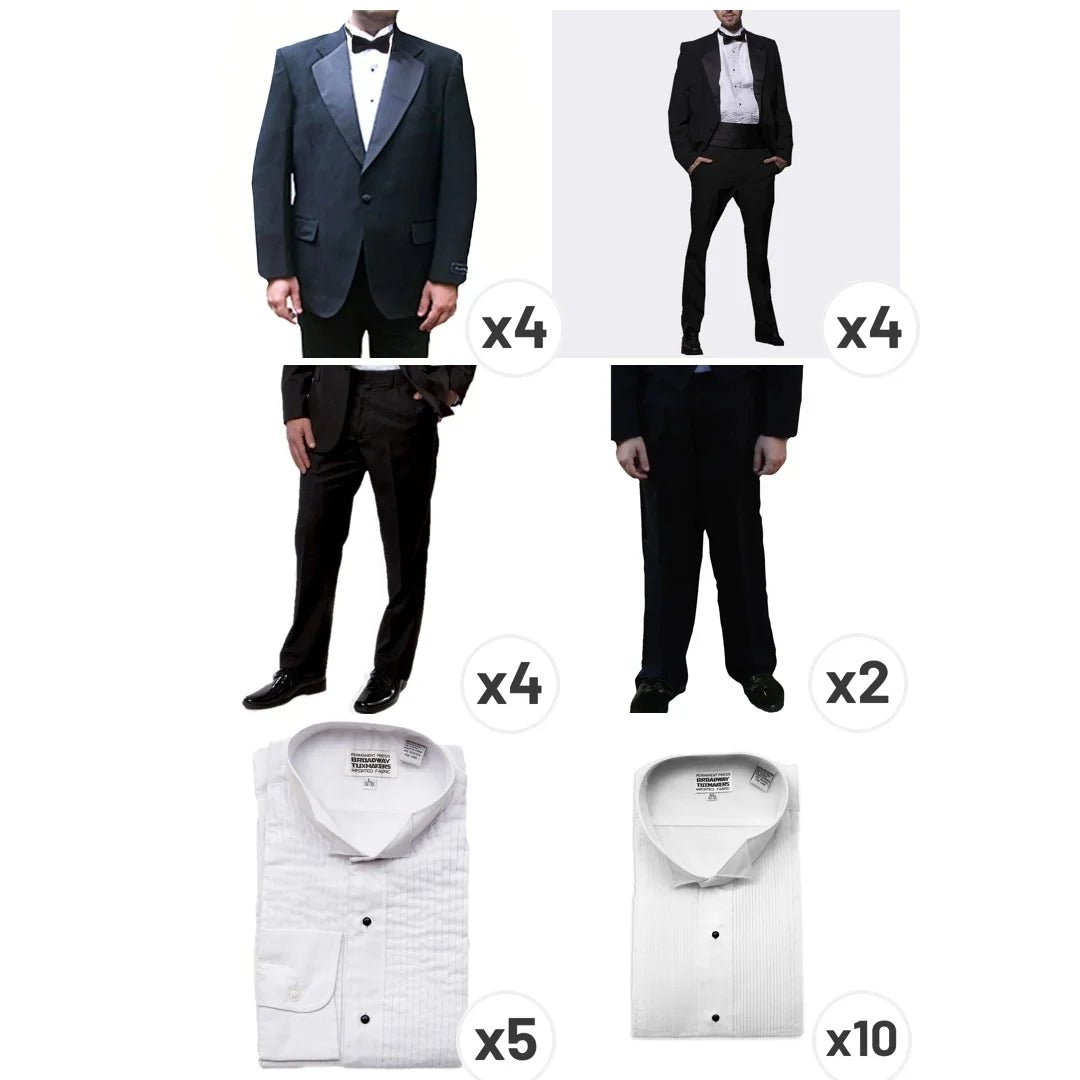 This lot consists of a variety of sizes of new men's tuxedo clothing items including: