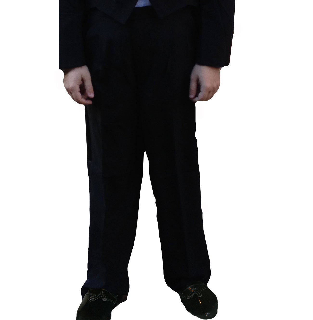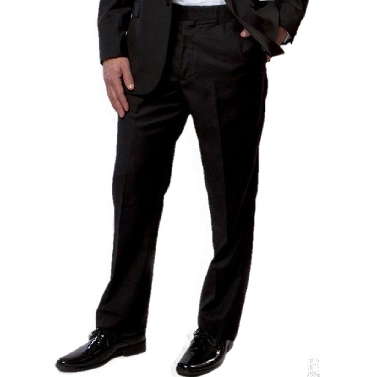 - 6 - Men's Tuxedo Pants: Black tuxedo pants with adjustable waist, unhemmed: Poly/Wool (two pair) and Polyester (four pair).