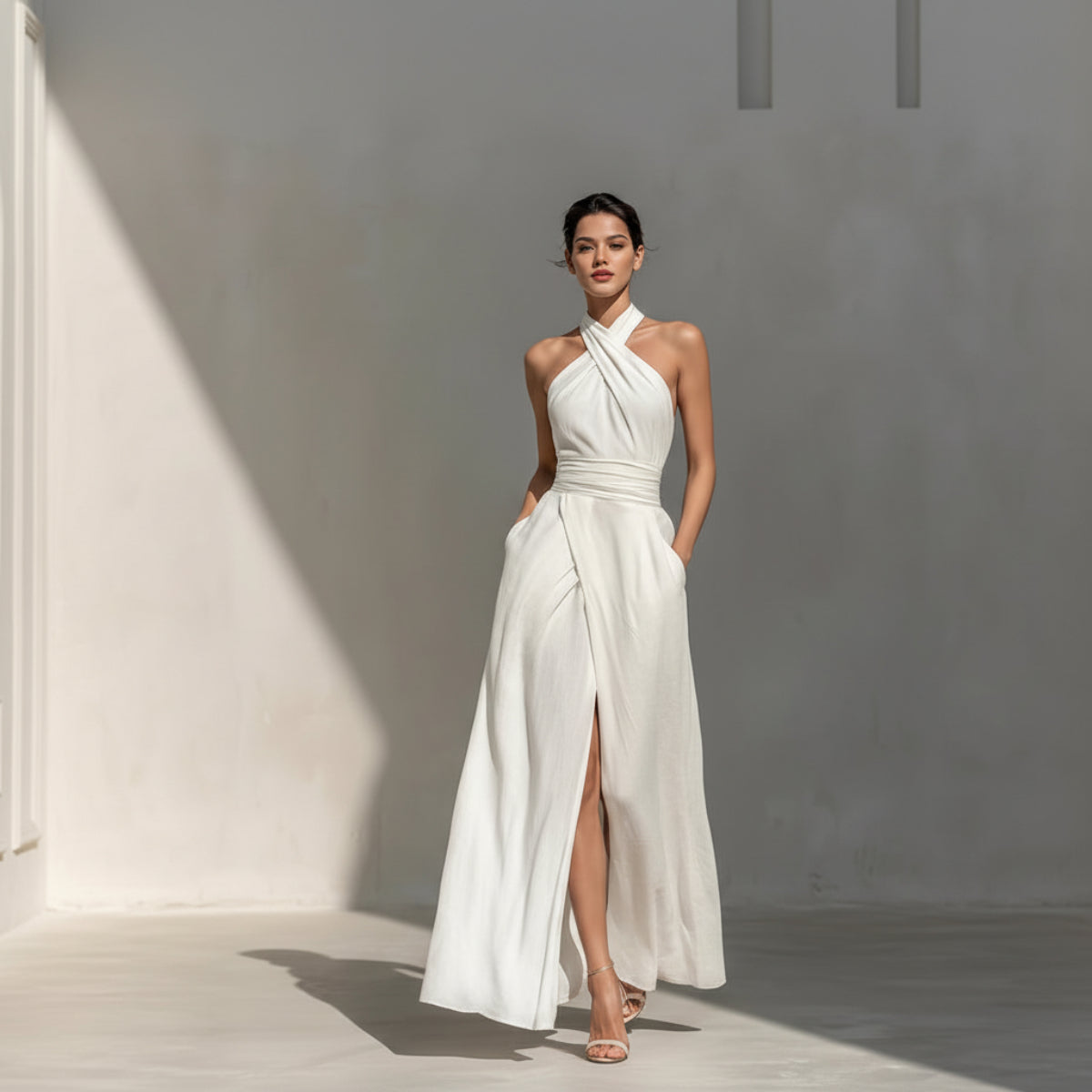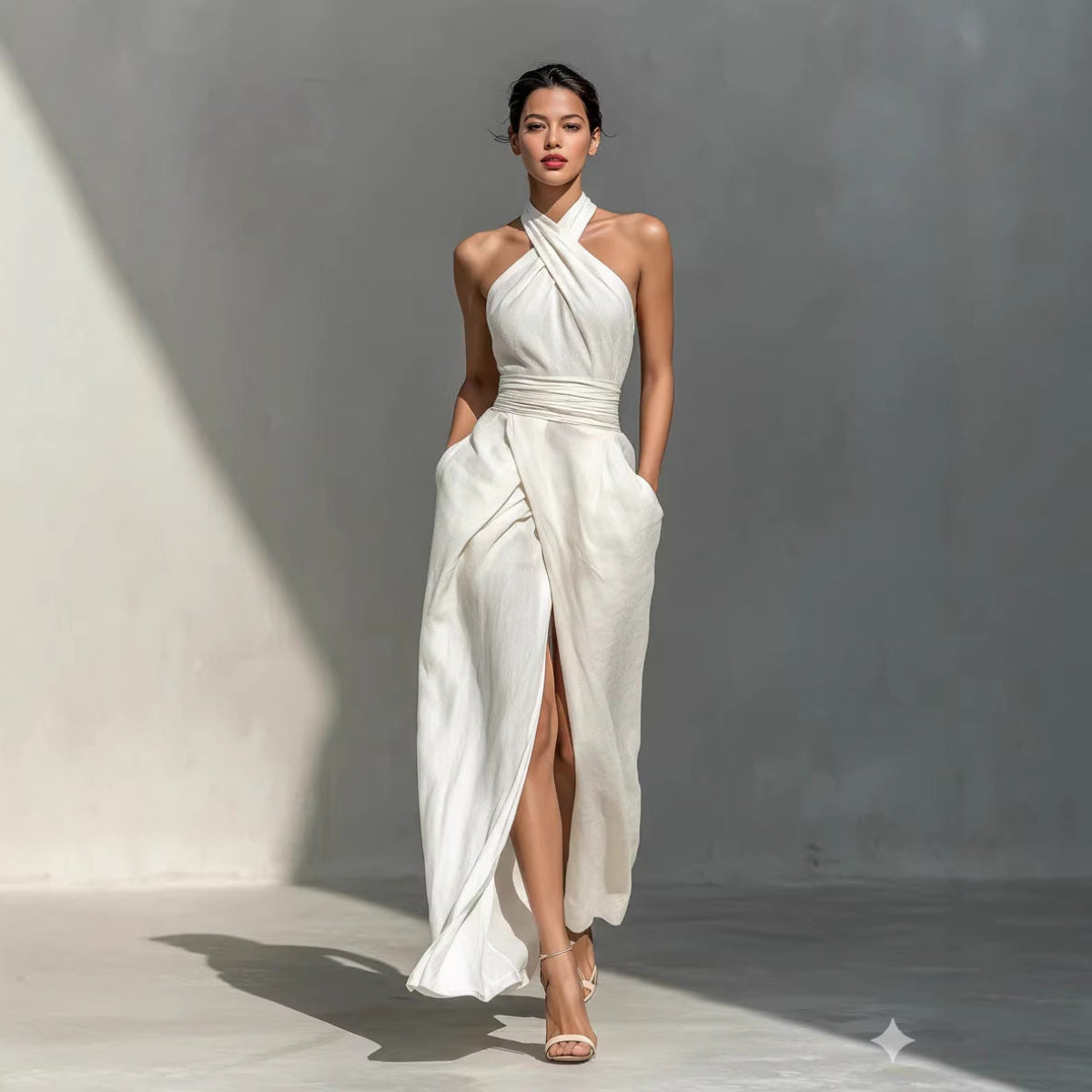 This elegant white dress combines a clean, timeless color with a flattering structured silhouette. The page lists a high waist, slim fit, A-line skirt, long length, and three-dimensional cutting craftsmanship, giving it a polished look that feels more elevated than a basic white dress. It is a one-piece dress with polyester fiber fabric and an elegant style profile.