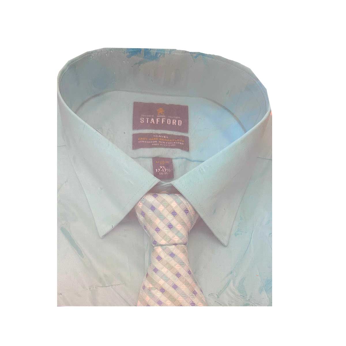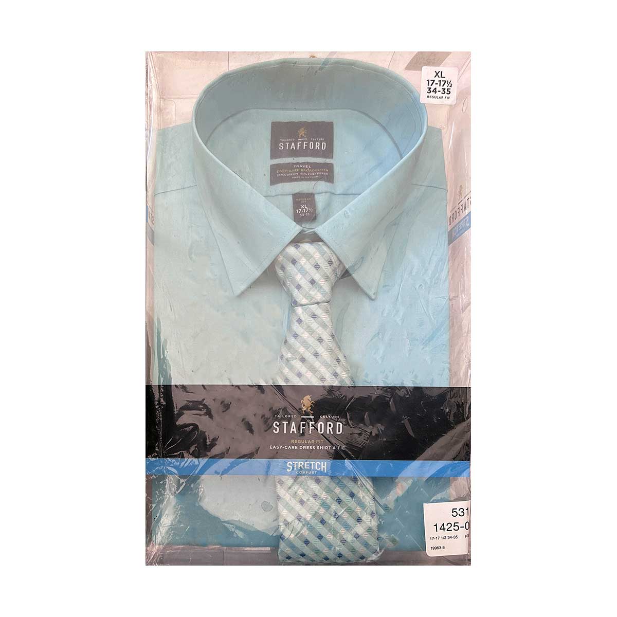 Stafford Regular Fit Easy-Care broadcloth dress shirt in "precious blue" color with a matching checkered tie.