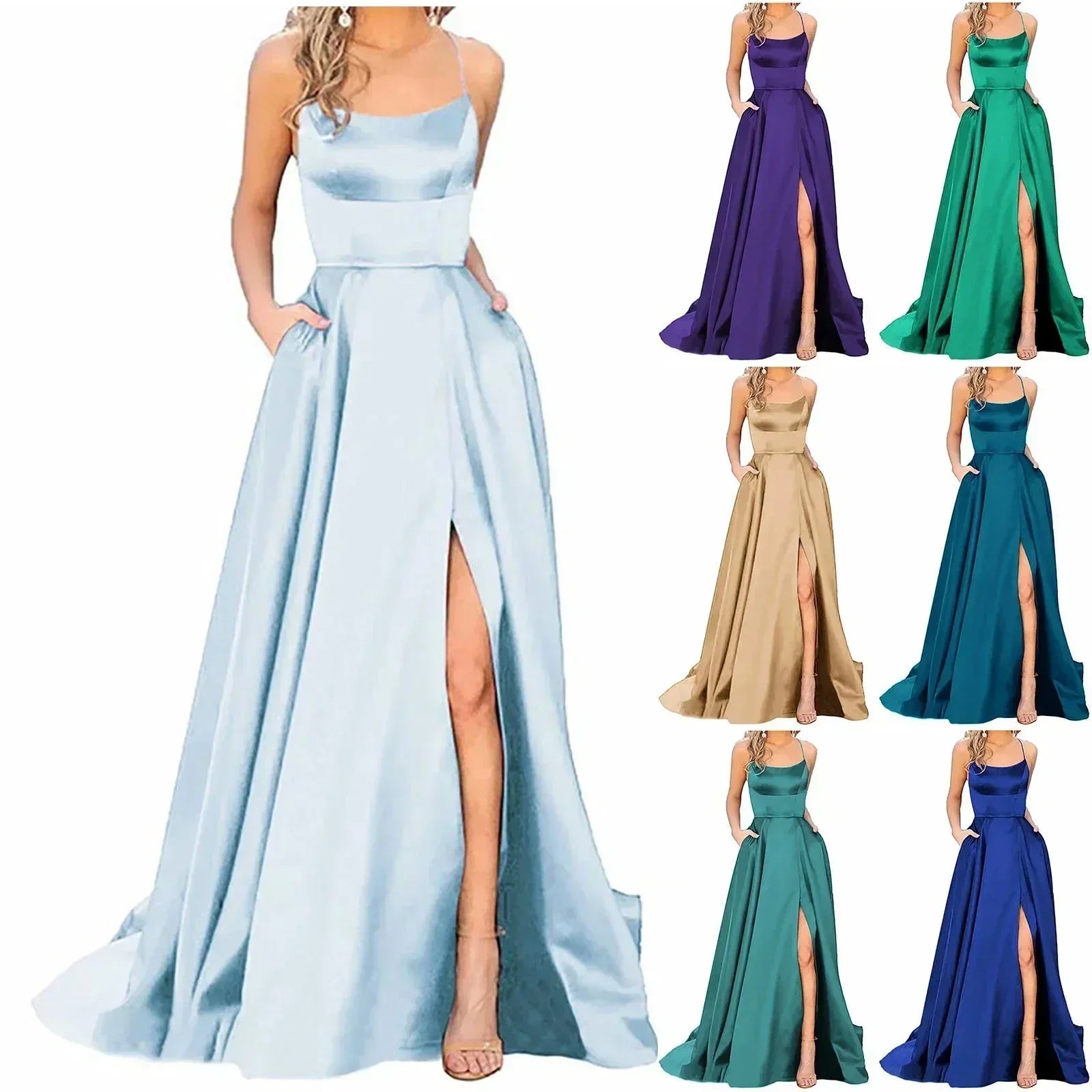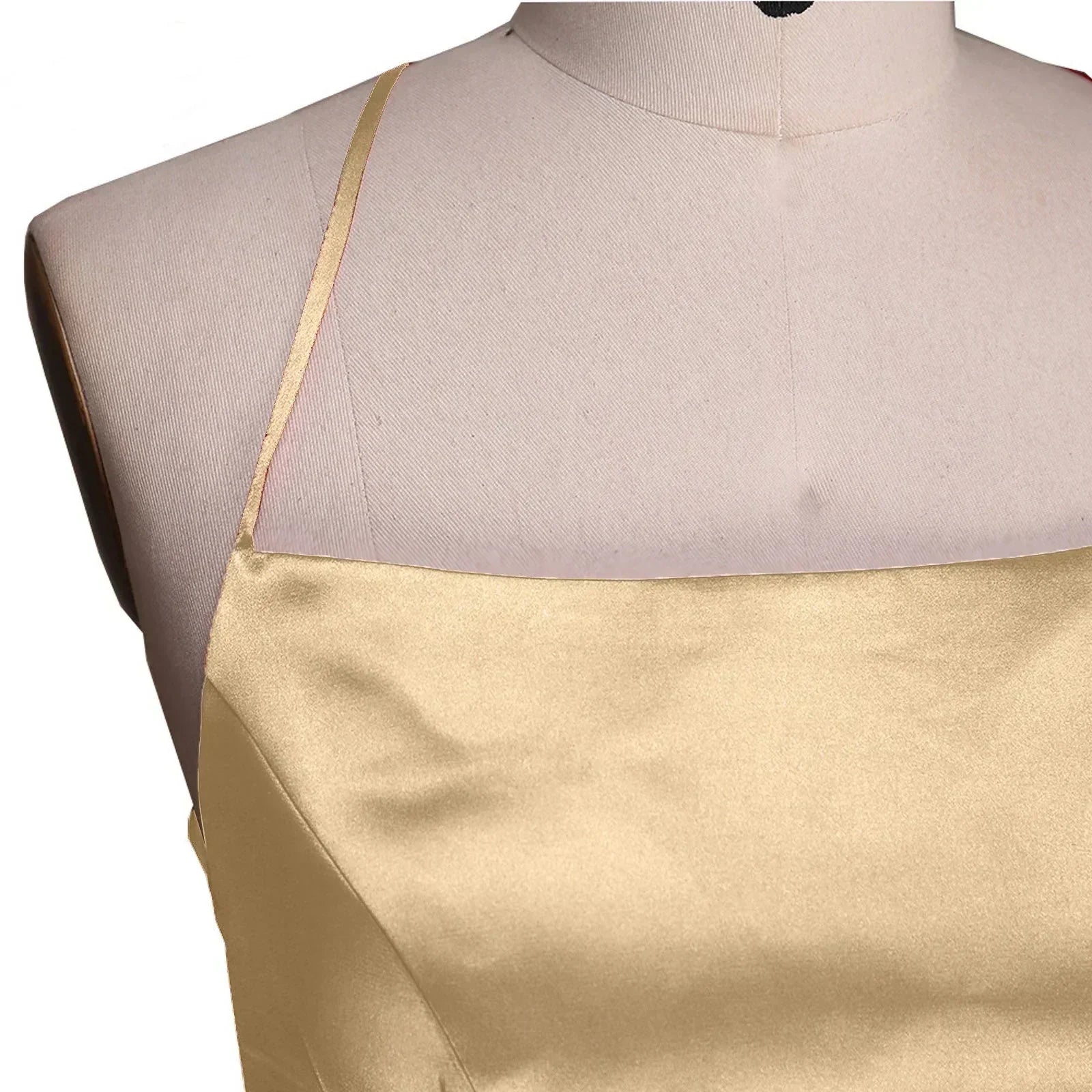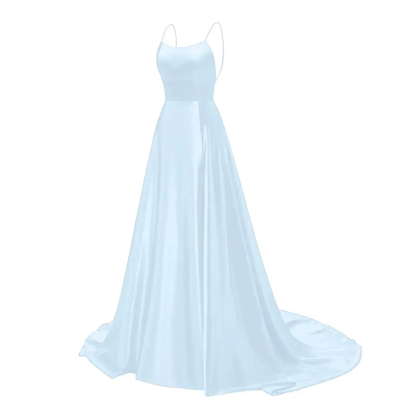 Chic and elegant satin prom dress perfect for any special occasion. Crafted from high-quality satin fabric that's breathable, slightly elastic, and resistant to wrinkles—ideal for all seasons. Features a sleeveless A-line silhouette with a halter top, criss-cross back, empire waist corset back, and open back design.